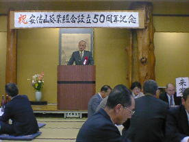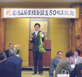 写真は50周年記念式典で皆さんの前で受賞した山葵の説明を照れながらしている私です。